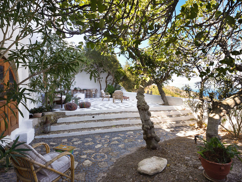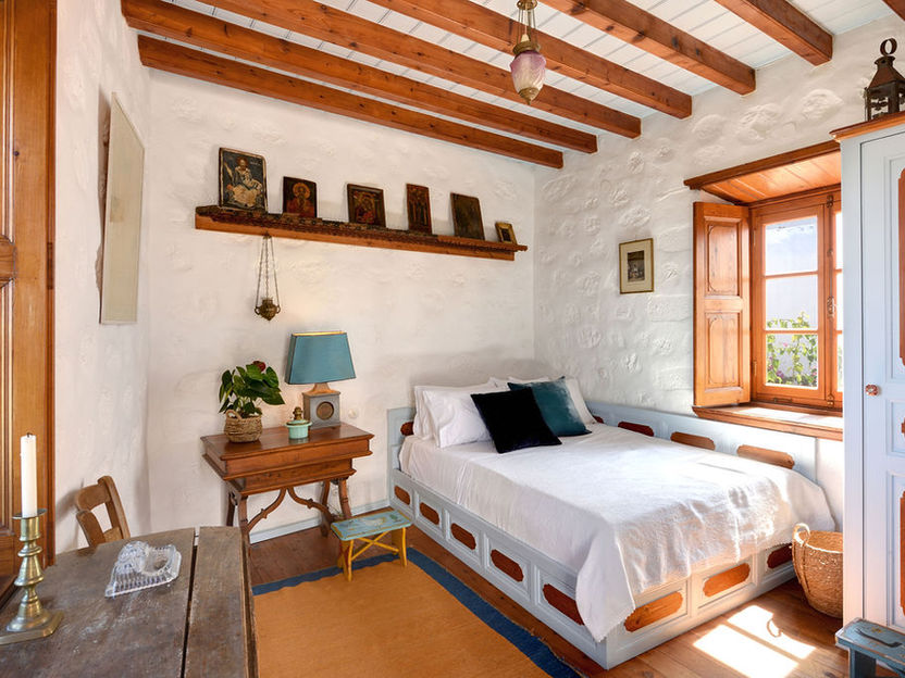 Once the family residence of General Themelis (1785-1825), a key figure in Greek War of Independence, this villa features a serene interior garden courtyard and a spacious outdoor lounge terrace with sea views. The villa can comfortably accommodate 6 guests, or up to 8 guests by making use of the two lofted single beds in the Double Bedroom Suite. The peculiarity of this house is that the Master Bedroom is composed of a traditional Patmian bed, which is in fact two double beds side by side on a theatrical raised platform.